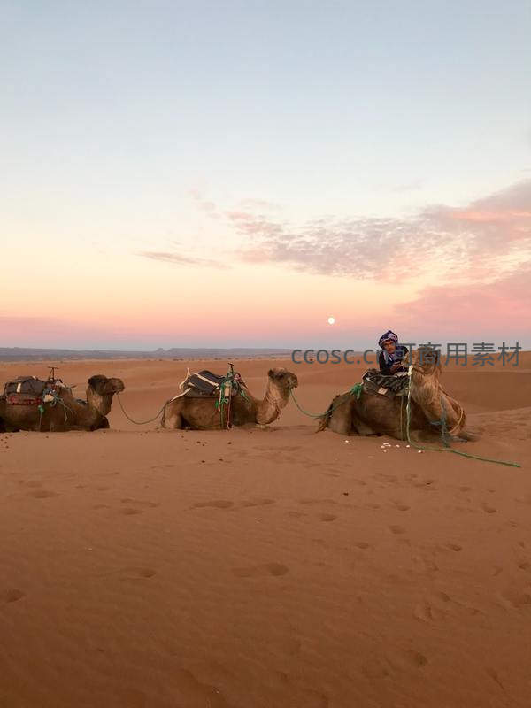 三只骆驼在晚霞映照的沙地上休憩,一弯明月悄然升起,柔和的光线洒满大地,勾勒出古老沙漠旅途中宁静祥和的一刻。