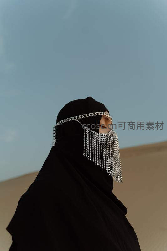黑纱蒙面女子在沙漠中凝望远方