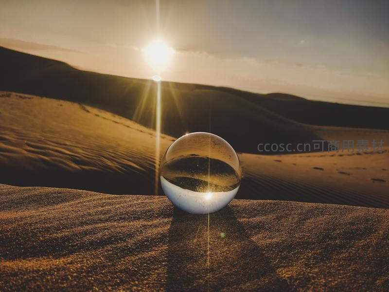 水晶球倒映夕阳下的沙漠山峦