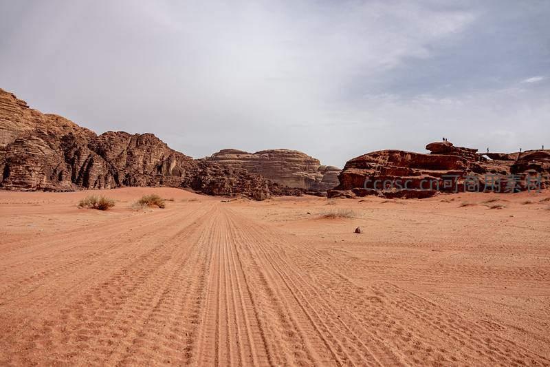 车辙印迹穿越红色峡谷通往远方