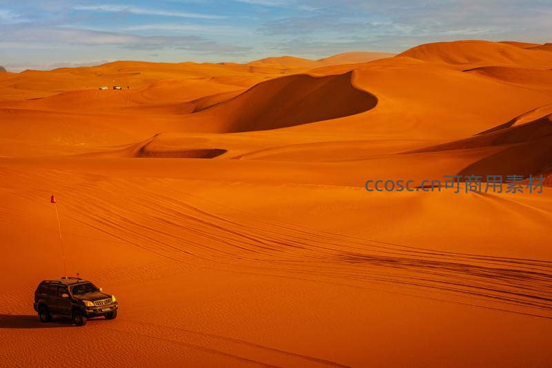 一辆越野车行驶在广袤的橙色沙丘上,留下蜿蜒车辙,远处天际线与流动的沙丘构成壮丽的沙漠风光。