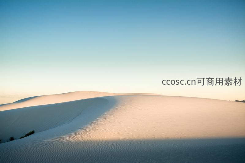 洁白细腻的沙丘在晨曦中泛着柔光,曲线优美如波浪,与清澈蓝天相接,营造出空灵纯净的视觉享受。