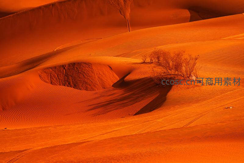 炽热阳光洒满橙红色沙丘,一株枯树在沙谷中投下浓重阴影,突显生命的坚韧与环境的严酷之美。