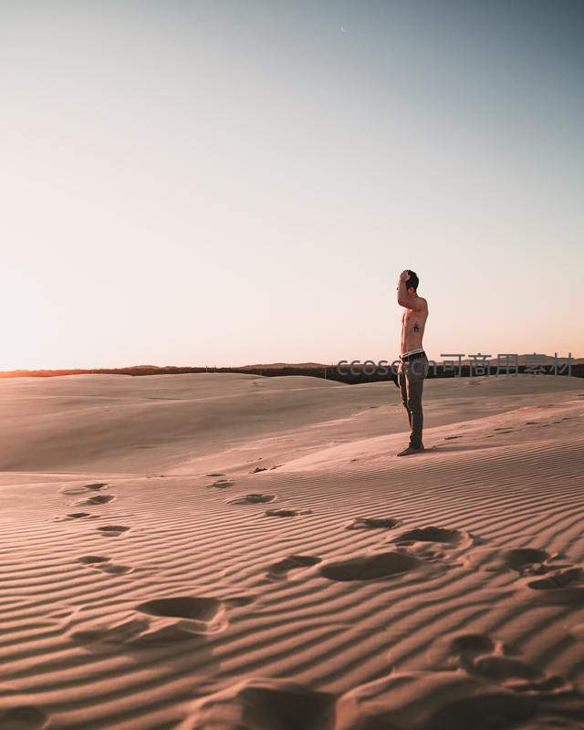 一名男子赤裸上身站在沙丘顶端,凝望远方天际,身后留下串串脚印,传递出对广阔天地的敬畏与沉思之情。