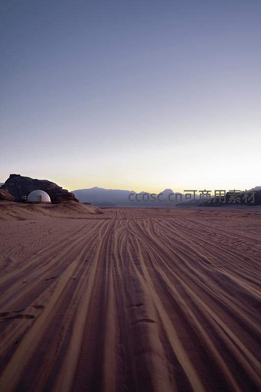 在广袤无垠的沙漠中,一座白色穹顶帐篷静立于沙丘之上,远方山脉剪影与渐变天空构成一幅宁静而壮丽的黄昏画卷。