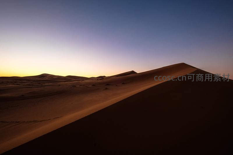 夕阳西下,金色的余晖洒在连绵起伏的沙丘上,天空由暖黄渐变为深蓝,营造出静谧而壮丽的沙漠黄昏景象。
