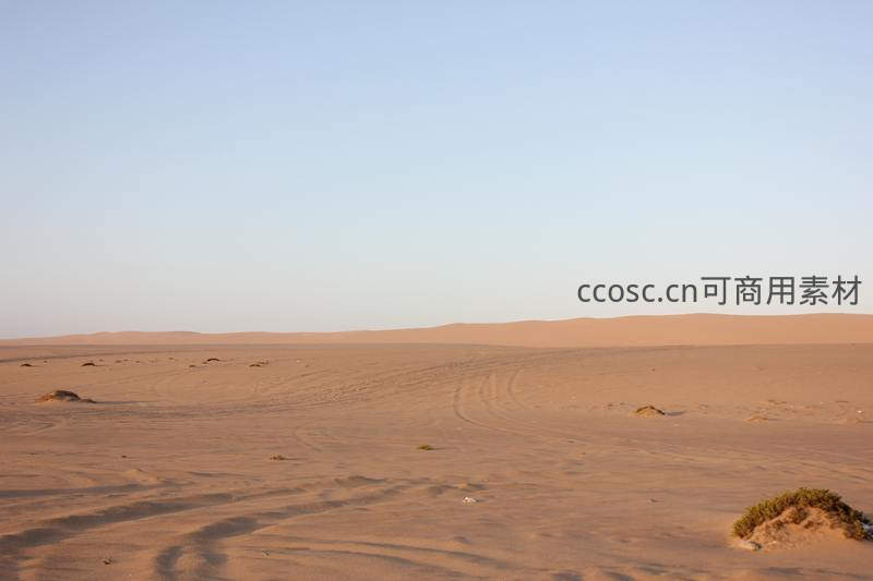 无垠的沙海中,几道清晰的车辙印痕延伸向远方的地平线,稀疏的植被点缀其间,展现出沙漠的苍茫与孤寂。