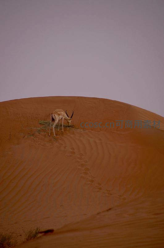一只羚羊在橙红色的沙丘上低头觅食,身后留下一串清晰的蹄印,与风蚀形成的波浪状沙纹共同构成一幅生动的荒漠生态图景。