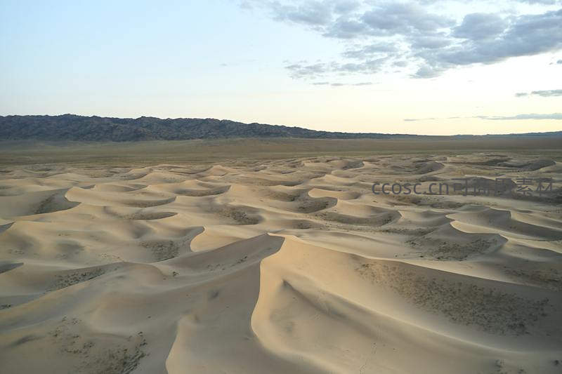 起伏的沙丘如同凝固的金色波浪,远处连绵的山脉在霞光中若隐若现,天空云层轻柔飘动,整个画面充满诗意与辽阔感。