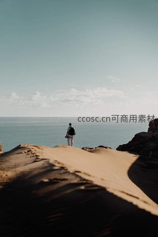 孤独旅人伫立沙丘之巅眺望无垠大海