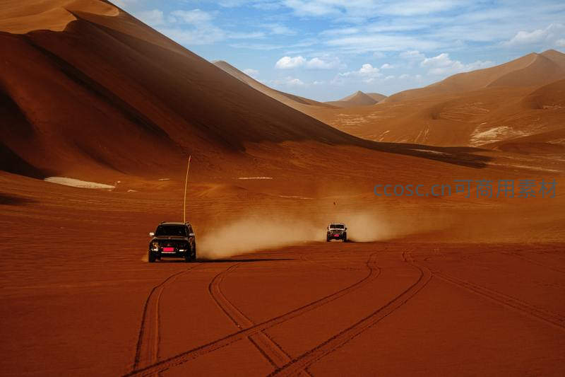 两辆越野车在广袤的红色沙漠中飞驰,卷起滚滚沙尘,轮胎划出清晰轨迹,展现了沙漠探险的刺激与壮阔。