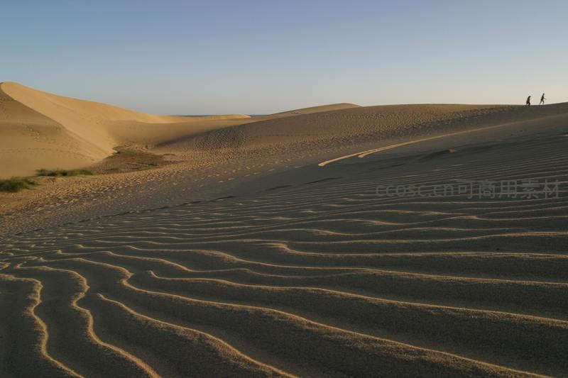 夕阳下,起伏的沙丘呈现出优美的波浪纹理,远处两人身影在天际线上行走,构成一幅宁静而辽阔的自然画卷。