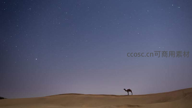 深邃夜空中繁星点点,一匹骆驼独自伫立在沙丘之上,其剪影与浩瀚星空形成强烈对比,营造出神秘而诗意的氛围。