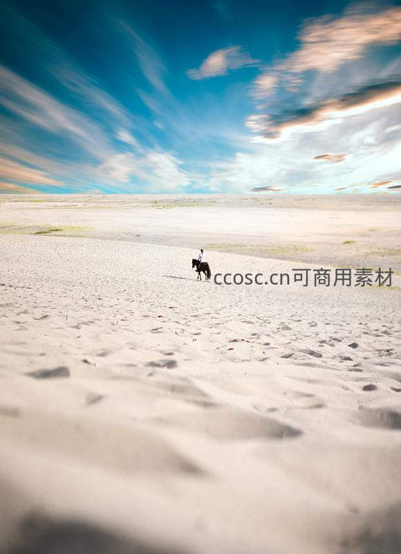 一人骑马行于无垠沙地,背景是因长曝光而拉丝流动的云层和蔚蓝天空,画面充满动感、自由与苍茫的意境。