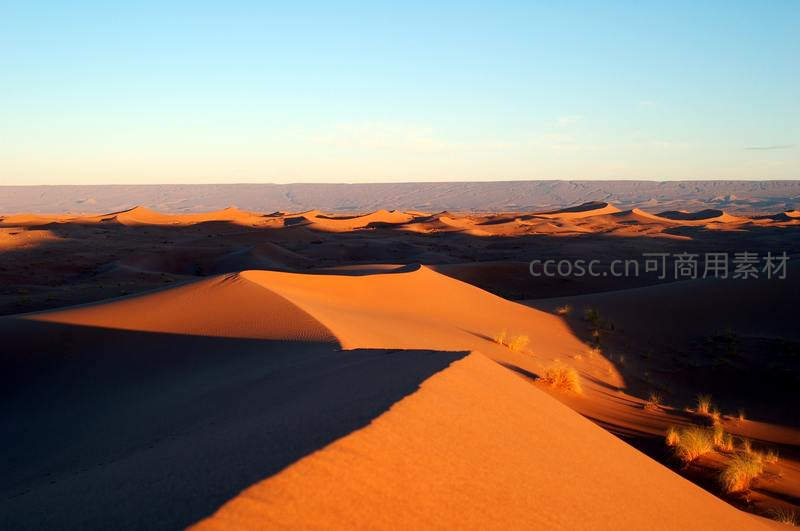 初升的太阳将沙丘染成温暖的橙色,明暗对比强烈,远处地平线辽阔,展现出沙漠清晨的宁静与壮美。
