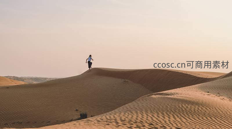 一位女子在金色沙丘顶上奔跑,身影轻盈,背景是柔和的暮色天空,传递出无拘无束、拥抱自然的动感与生命力。