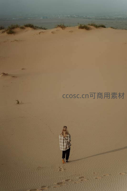 一位女子独自走在起伏的沙丘上,身后留下一串脚印,远处隐约可见城镇轮廓,画面充满诗意与淡淡的寂寥。
