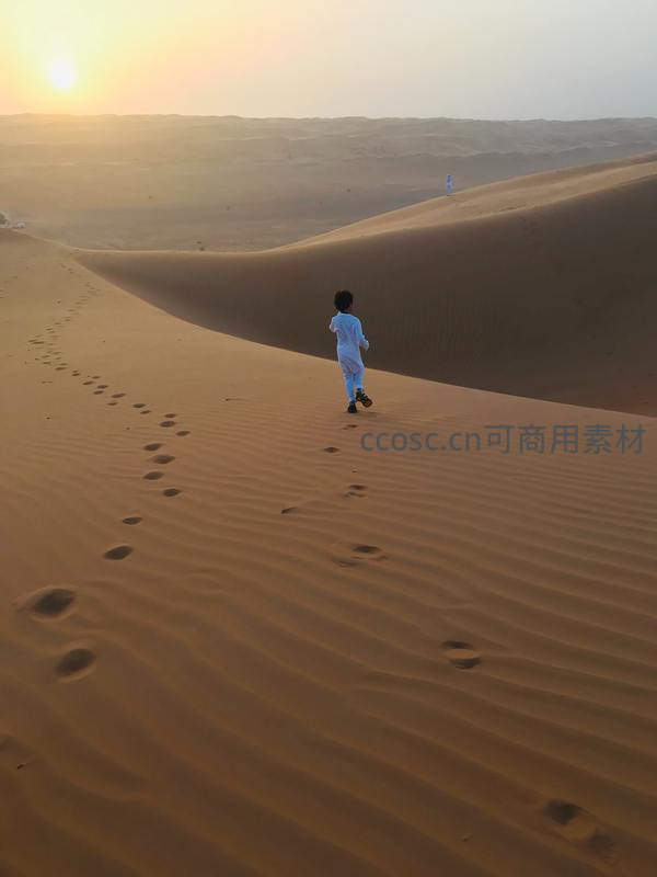孩童踏着脚印奔跑于沙丘之上