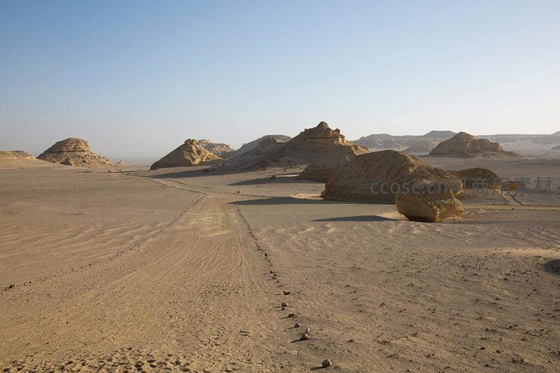 荒漠奇岩与车辙印迹的静谧画卷