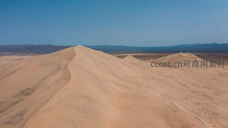 在一片纯净的蓝色天空下,巨大的沙丘群延绵不绝,其柔和的曲线与远处朦胧的山脉共同构成了一幅辽阔而宁静的荒漠画卷。