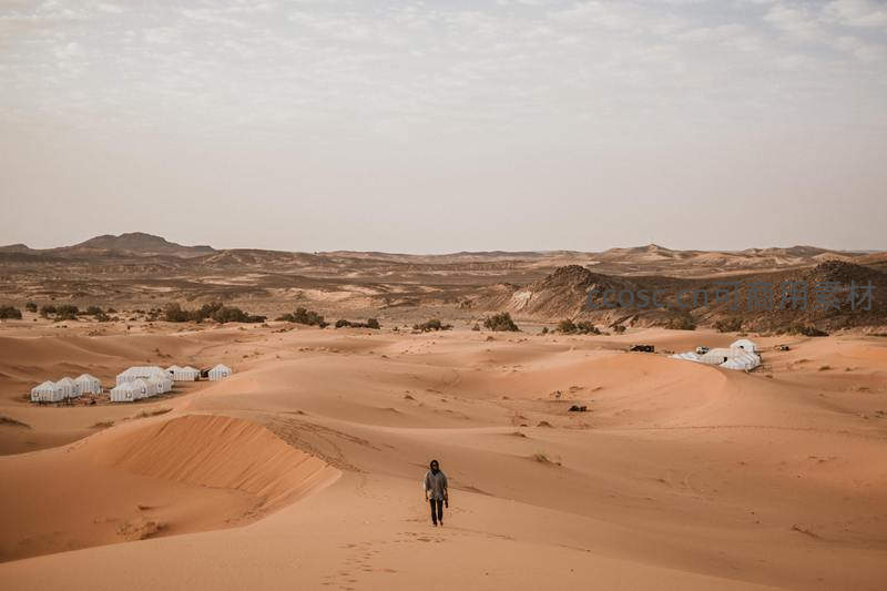 橙色沙海中,一人走向远方白色帐篷营地