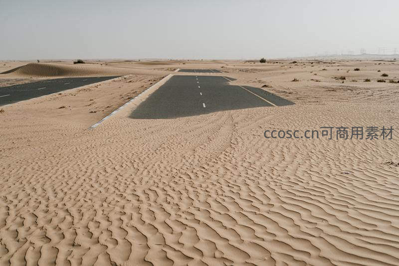 一条笔直的柏油路穿过起伏的沙丘,白色标线清晰可见,沙浪如波涛般涌向路面,展现人迹与自然的交融。