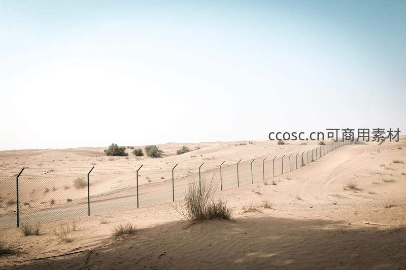 一道金属围栏在起伏的沙丘间曲折延伸,稀疏植被点缀四周,凸显人类活动对荒漠地貌的介入与分割。