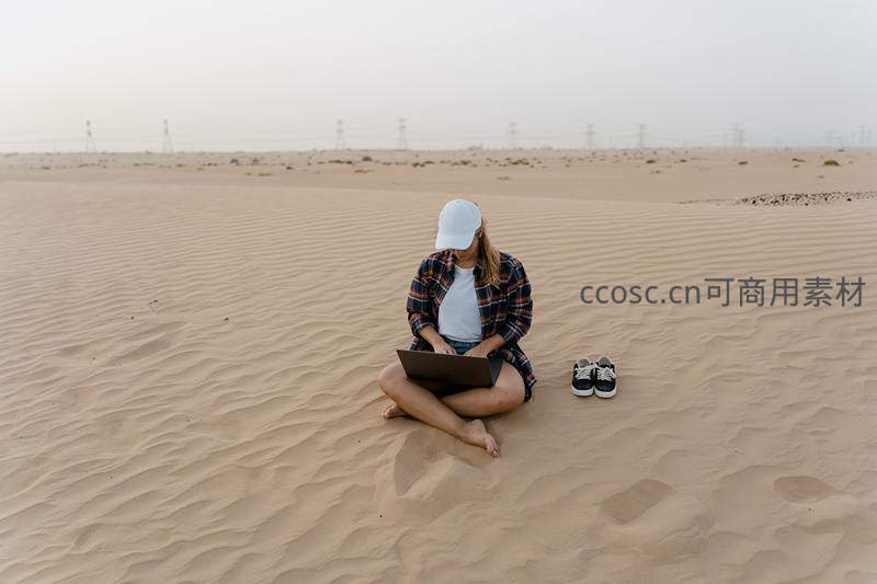 一位戴着白色帽子的女子盘腿坐在广袤的沙漠沙丘上,专注地使用着膝上的笔记本电脑,身旁放着一双运动鞋,背景是连绵的沙丘和远处的电线塔。