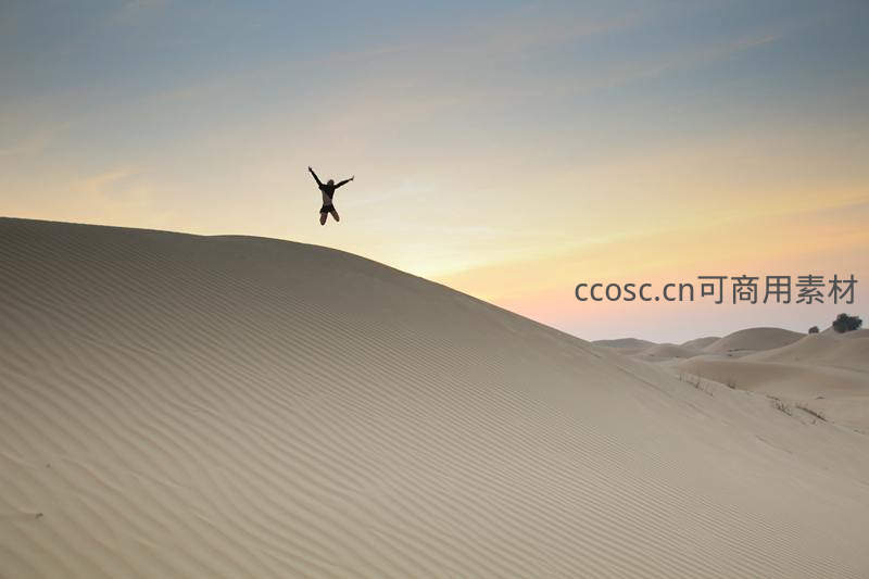 在绚丽的日落余晖下,一个人的剪影高高跃起在巨大的沙丘顶端,双臂张开,仿佛拥抱自由,身后是渐变色彩的天空和无垠的沙海。