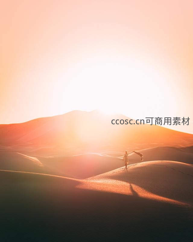 金色夕阳洒满连绵沙丘,一人一狗的剪影在沙脊上行走,长影拖曳,营造出静谧而壮阔的氛围。