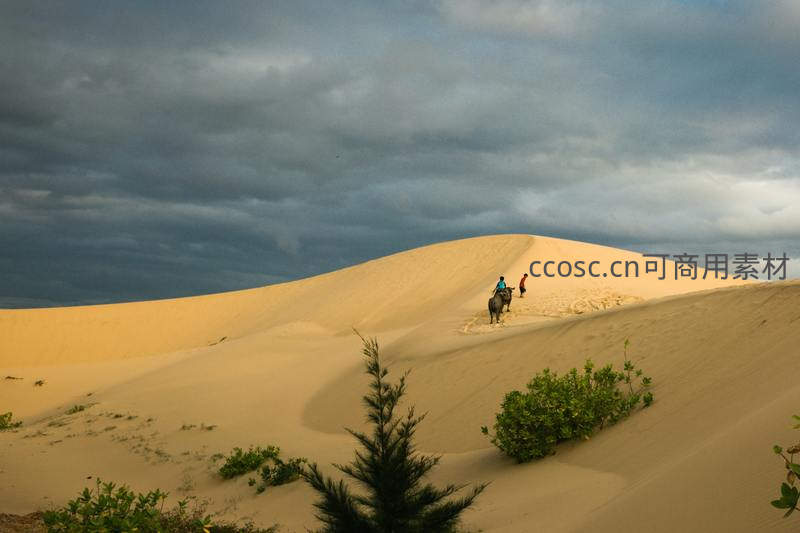 乌云密布的天空下,两人一骑一走攀爬巨大沙丘,前景点缀稀疏绿植,展现荒野中的生动旅程。