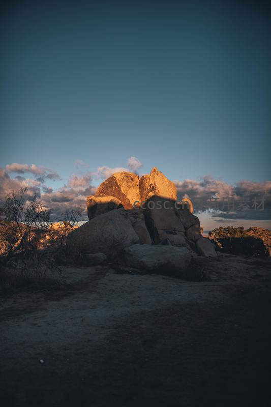 暮色中被照亮的巨大岩石