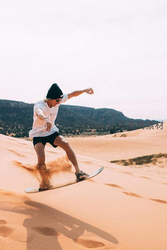 一位年轻人在金色沙丘上玩沙板,身后扬起沙尘,背景是连绵山脉,充满活力与自由气息。