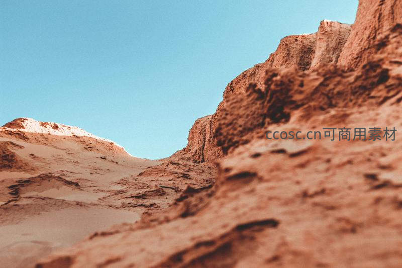 低角度仰拍陡峭的红褐色岩壁,蓝天为背景,凸显沙漠峡谷的雄伟与粗犷,充满原始自然力量。