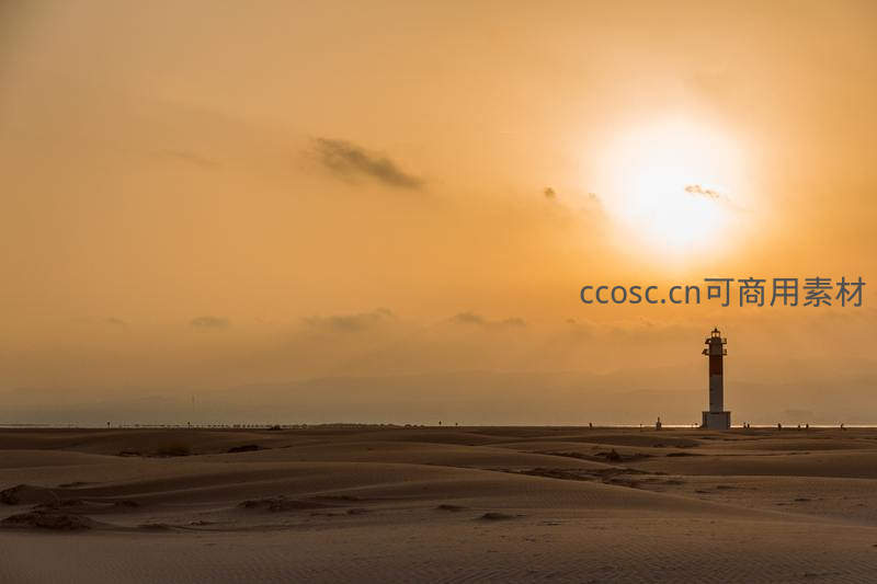 金色的夕阳将天空染成一片温暖的橙黄,远处的灯塔静静伫立在沙丘尽头,为归途者指引方向,画面充满诗意与宁静。