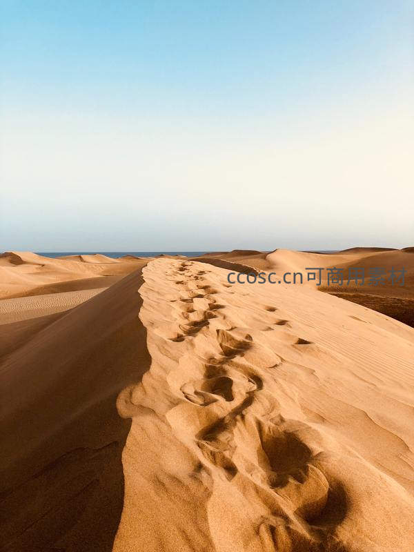 一串清晰的脚印沿着沙丘的脊线蜿蜒向前,仿佛引领观者踏上一段未知的旅程,在无垠的金色沙海中寻找属于自己的方向。