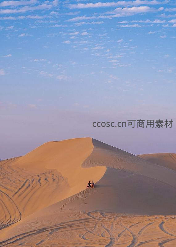 在巨大的沙丘之巅,两个微小的身影正俯瞰着这片壮丽的沙海,强烈的大小对比突显了人类在浩瀚自然面前的渺小与敬畏。