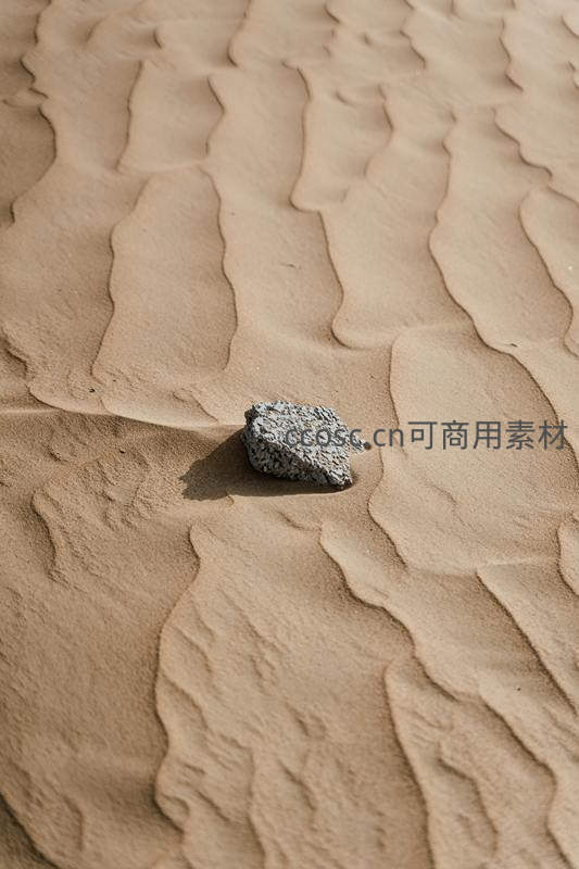 一块粗糙的岩石安卧于被风雕琢出优美波浪纹路的沙地上,光影交错间凸显自然力量与静谧之美,构图极简而富有张力。