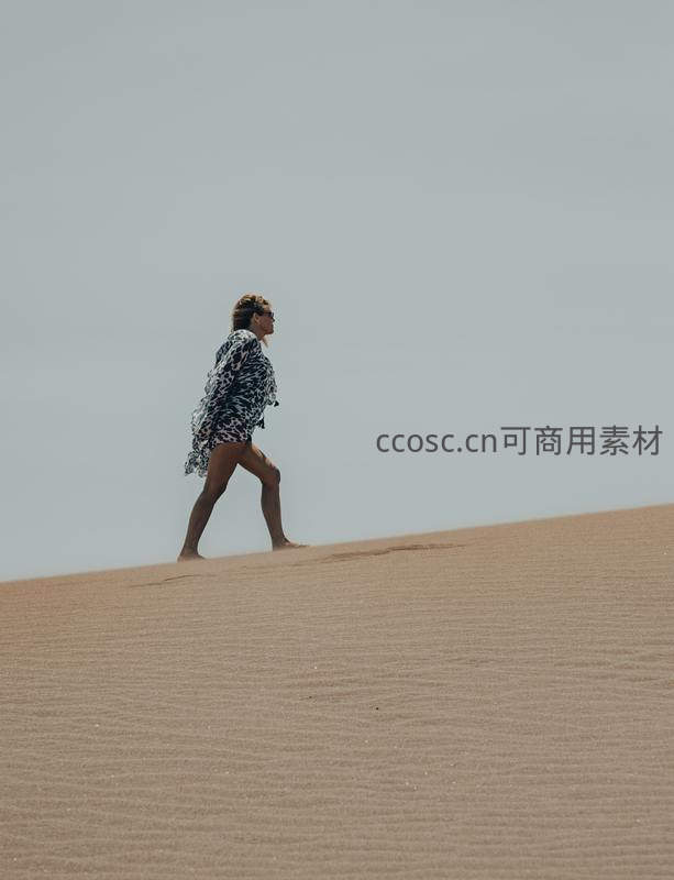 一位身着飘逸罩衫的女子赤足行走在起伏的沙丘顶端,迎着微风与阳光,姿态优雅从容,诠释了沙漠中的自由与浪漫。