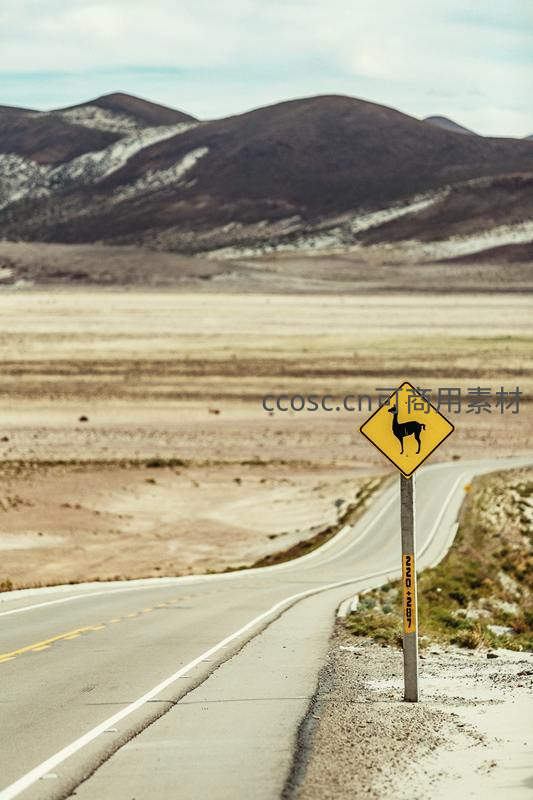 蜿蜒公路边立着黄色羊驼警示牌,背景是苍茫高原与远山,提醒司机注意野生动物出没。
