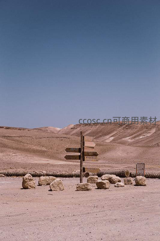 一座木制多向路标矗立于荒芜沙地,周围散落巨石,指向远方未知路径,充满神秘探索感。