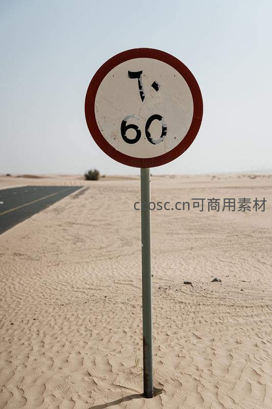 一个被风沙磨蚀的圆形限速60公里路牌孤零零立在沙地边缘,诉说着这片土地的严酷与寂静。