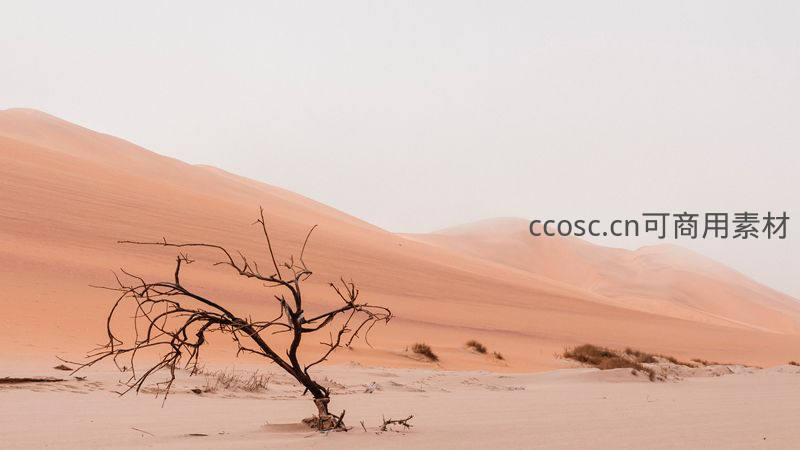 一棵扭曲的枯树在朦胧的晨光中形成黑色剪影,背景是柔和的粉橙色沙丘,整个画面弥漫着一种静谧的孤独感。
