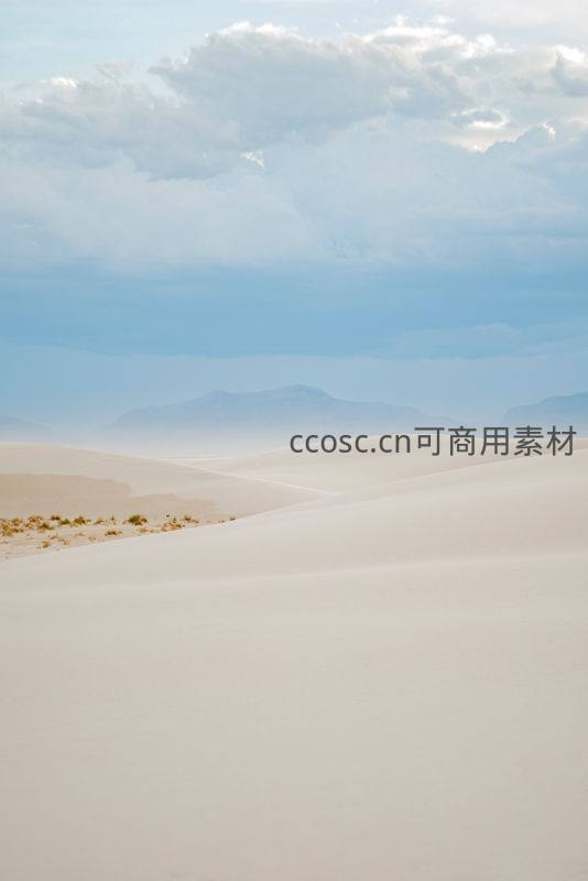 薄雾笼罩远山与纯净白沙丘相映