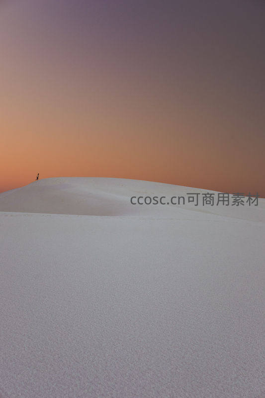 在绚丽的橙紫色日落余晖中,一个渺小的人影独自站在巨大的白色沙丘顶端,感受着天地间的广阔与宁静。