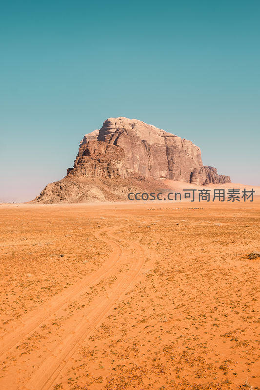 一条蜿蜒的车辙通向远方一座雄伟的孤峰,四周是广袤的荒漠,展现了大自然鬼斧神工的壮丽与苍凉。