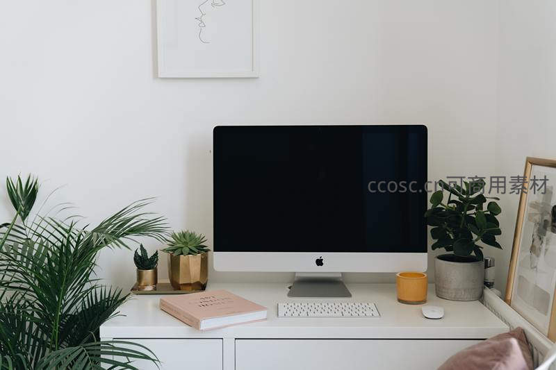 纯白色桌面上摆放着Apple iMac,两侧点缀着形态各异的绿植和艺术画框,整体色调柔和,营造出宁静、清新且高效的居家办公环境。
