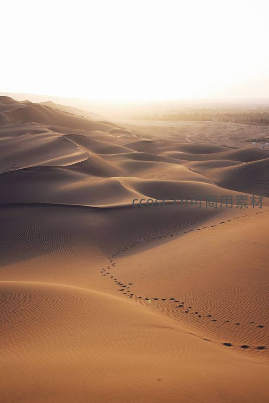 金色夕阳下,一串清晰的脚印蜿蜒穿过起伏的沙丘,是旅人独自穿越这片广阔沙漠留下的唯一印记。