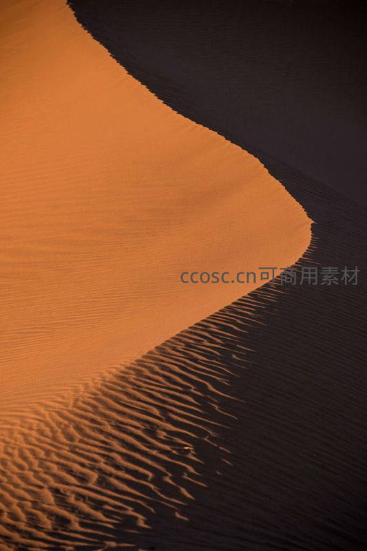 沙丘的柔和曲线在强烈的光影对比下呈现出抽象的美感,细腻的沙纹如同大自然精心雕琢的艺术品。