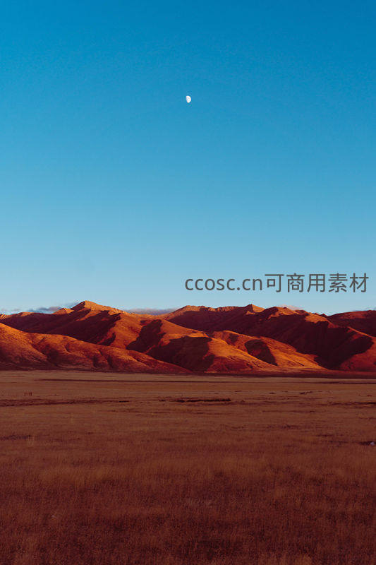 一弯新月悬于澄澈蓝天之上,映衬着远方被夕阳染红的连绵山脉和广袤草原,尽显苍茫与宁静之美。